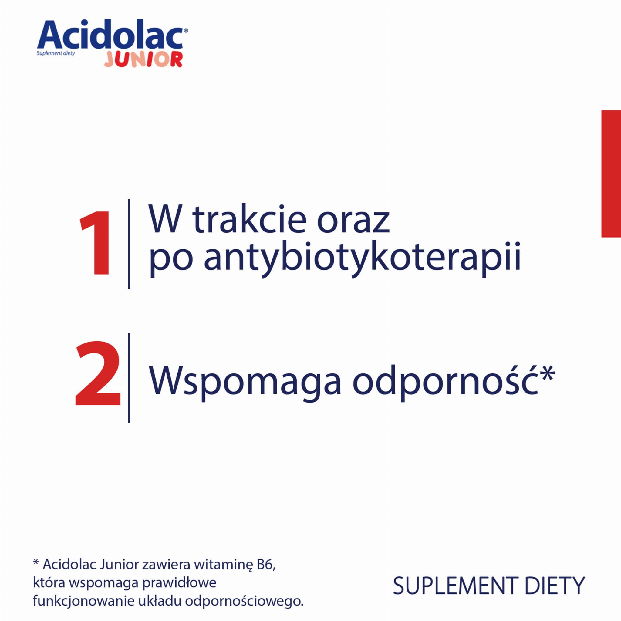 Opis produktu / przeznaczenie: Acidolac® Junior to preparat łączący w składzie szczepy bakterii Lactobacillus acidophilus La-14TM i Bifidobacterium lactis BI-04TM, inulinę oraz witaminę B6, która wspomaga prawidłowe funkcjonowanie układu odpornościowego.