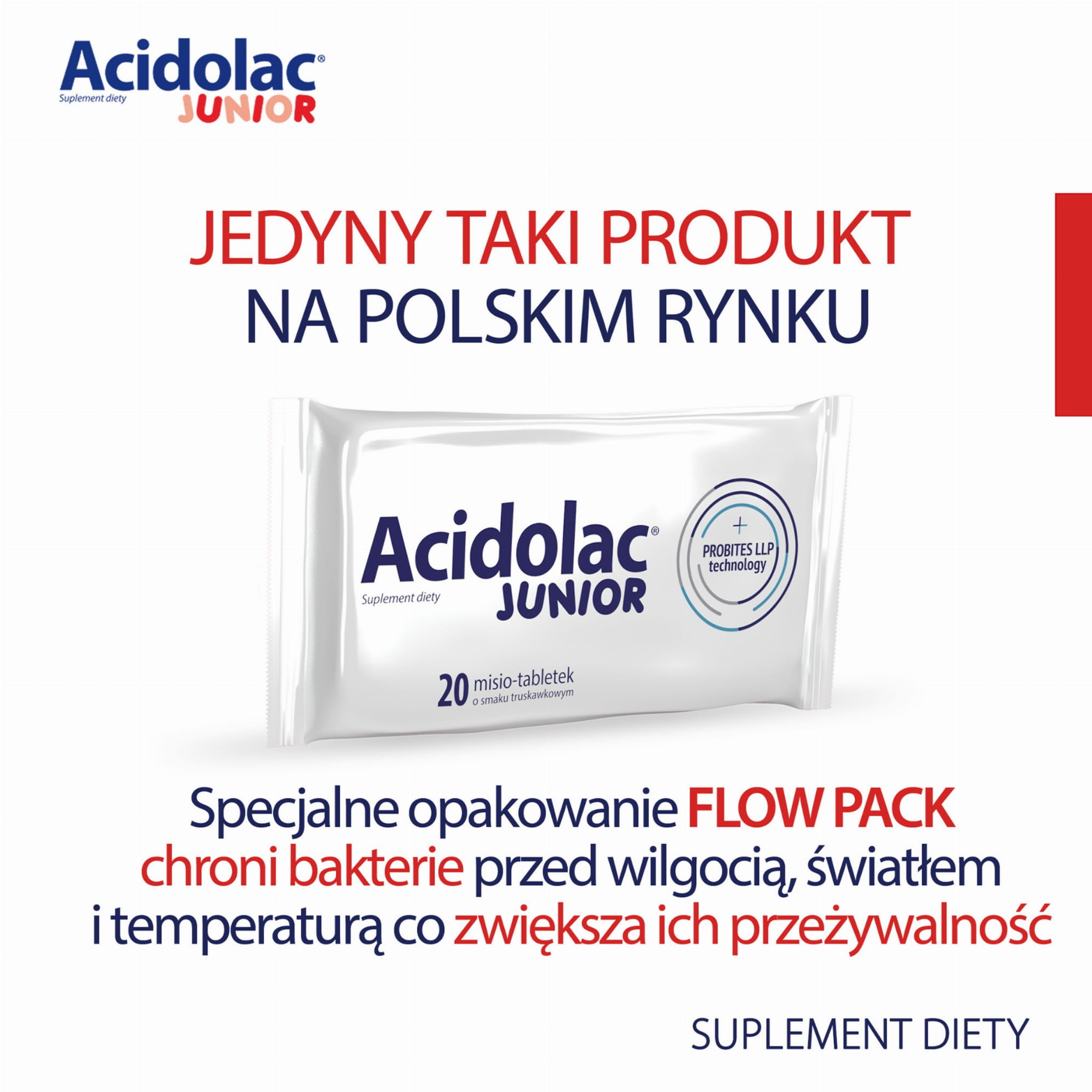 Składniki zawarte w preparacie wydłużają czas przeżycia bakterii i ułatwiają kolonizację jelita. Bakterie zawarte w Acidolac® Junior występują naturalnie w przewodzie pokarmowym człowieka, są odporne na działanie soku żołądkowego i kwasów żółciowych oraz łatwo zasiedlają przewód pokarmowy. W celu zwiększenia ochrony przed czynnikami zewnętrznymi i przeżywalności bakterii blister z tabletkami został dodatkowo zapakowany w folię barierową.