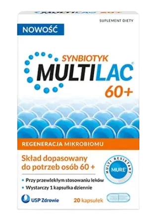 Multilac 60+ to innowacyjny preparat dostosowany specjalnie do potrzeb osób powyżej 60 roku życia, zwłaszcza przy długotrwałym stosowaniu leków. Każda kapsułka zawiera imponujące 10 miliardów korzystnych bakterii.